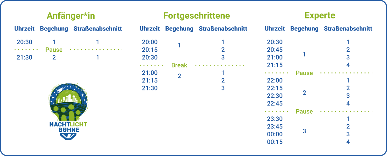 - Bei der diesjährigen Kampagne “Zeit für die Nacht” wollen wir herausfinden, wie sich die Lichter, die eingeschaltet sind, im Laufe des Abends und der Nacht verändern. Daher bitten wir dich, deine Straßenabschnitte mindestens zweimal zu begehen, wobei zwischen den Erhebungen mindestens eine Stunde liegen sollte. Drei (oder mehr) Erhebungen sind ebenfalls willkommen, ebenso wie längere Zeiträume zwischen den Erhebungen!